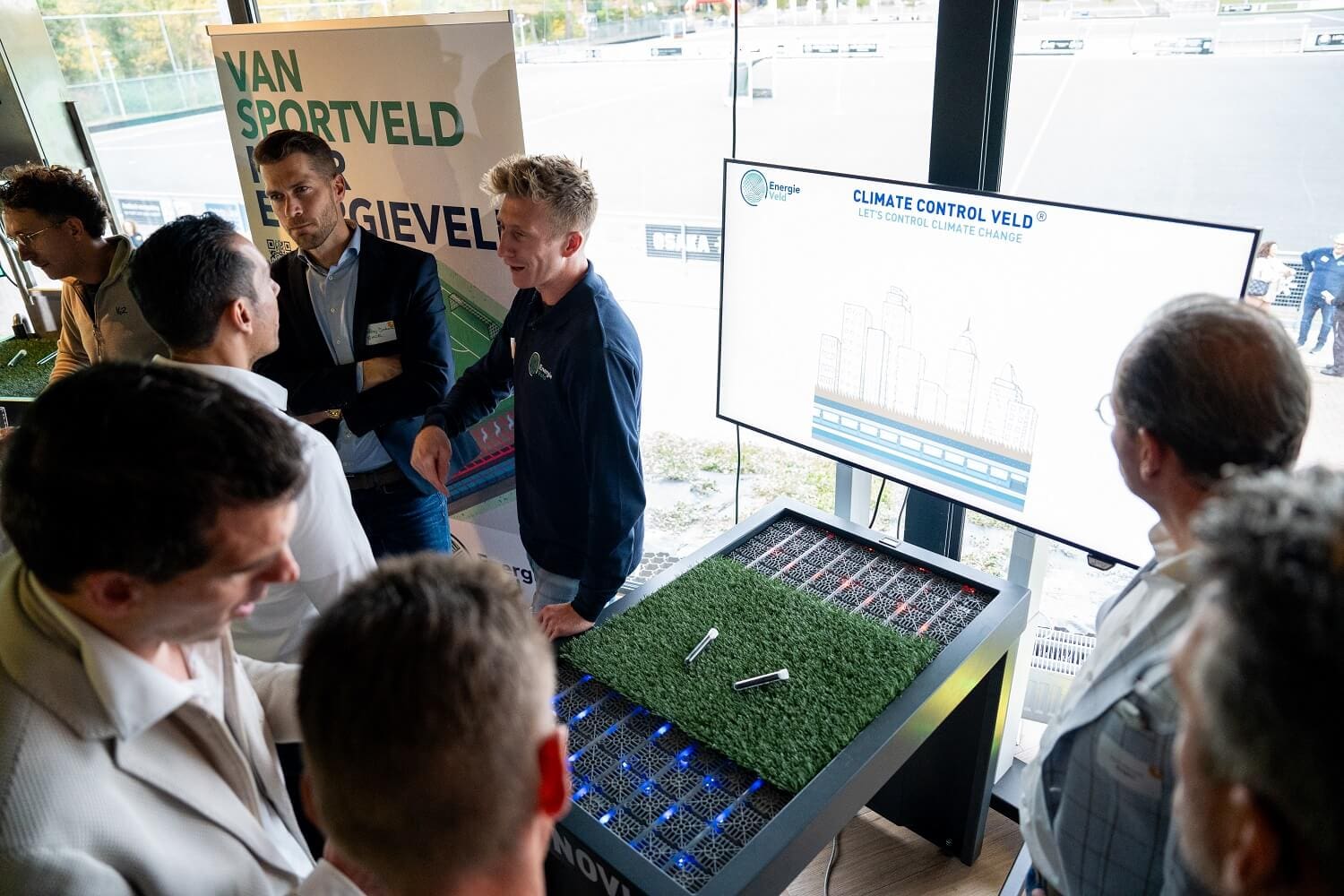 - Onder de vlag van EnergieVeld wordt gewerkt aan sportparken waar energie, water en welzijn samenkomen. Hun zogenaamde collectorveld wekt warmte op. Het Climate Controlveld vangt regenwater op voor koeling en waterbeheer. Circulair geproduceerd kunstgras maakt hergebruik van materialen mogelijk. Met hun visie transformeert een sportpark straks van speelplek tot een duurzame en flexibele hub die bijdraagt aan een klimaatbestendige en energieneutrale stad.