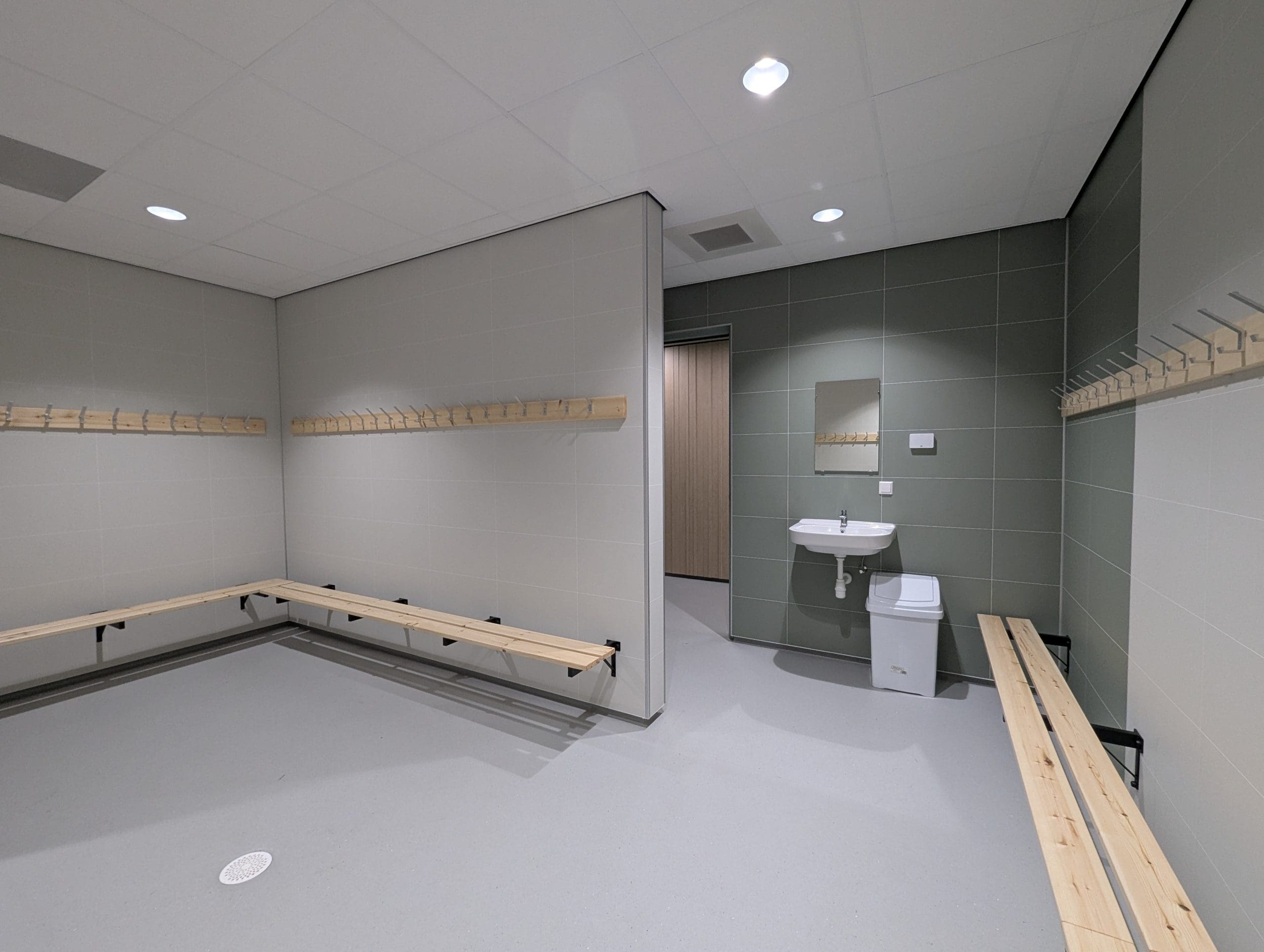 Het is een trend van de afgelopen tijd dat het douchegebruik terugloopt. Door het telkens verwarmen of op temperatuur houden van warm water morsen we energie. Daarom is er bewust voor gekozen om niet alle kleedruimtes van douches te voorzien. Er zijn nu in totaal vier douches wat ook de onderhoudskosten drukt.