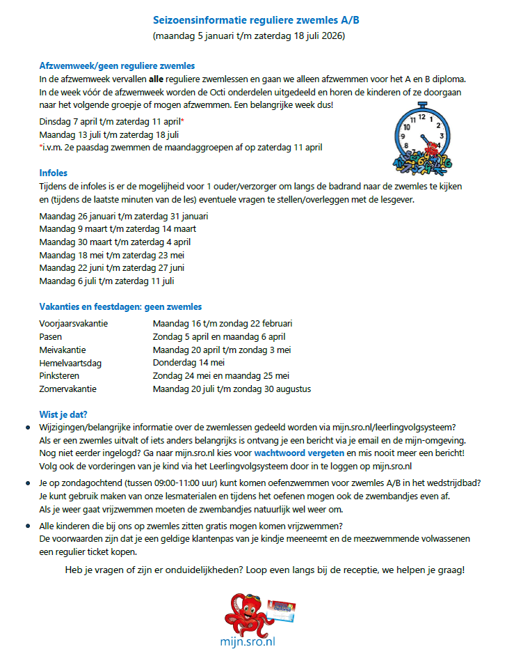 Belangrijke informatie voor reguliere zwemles a/b